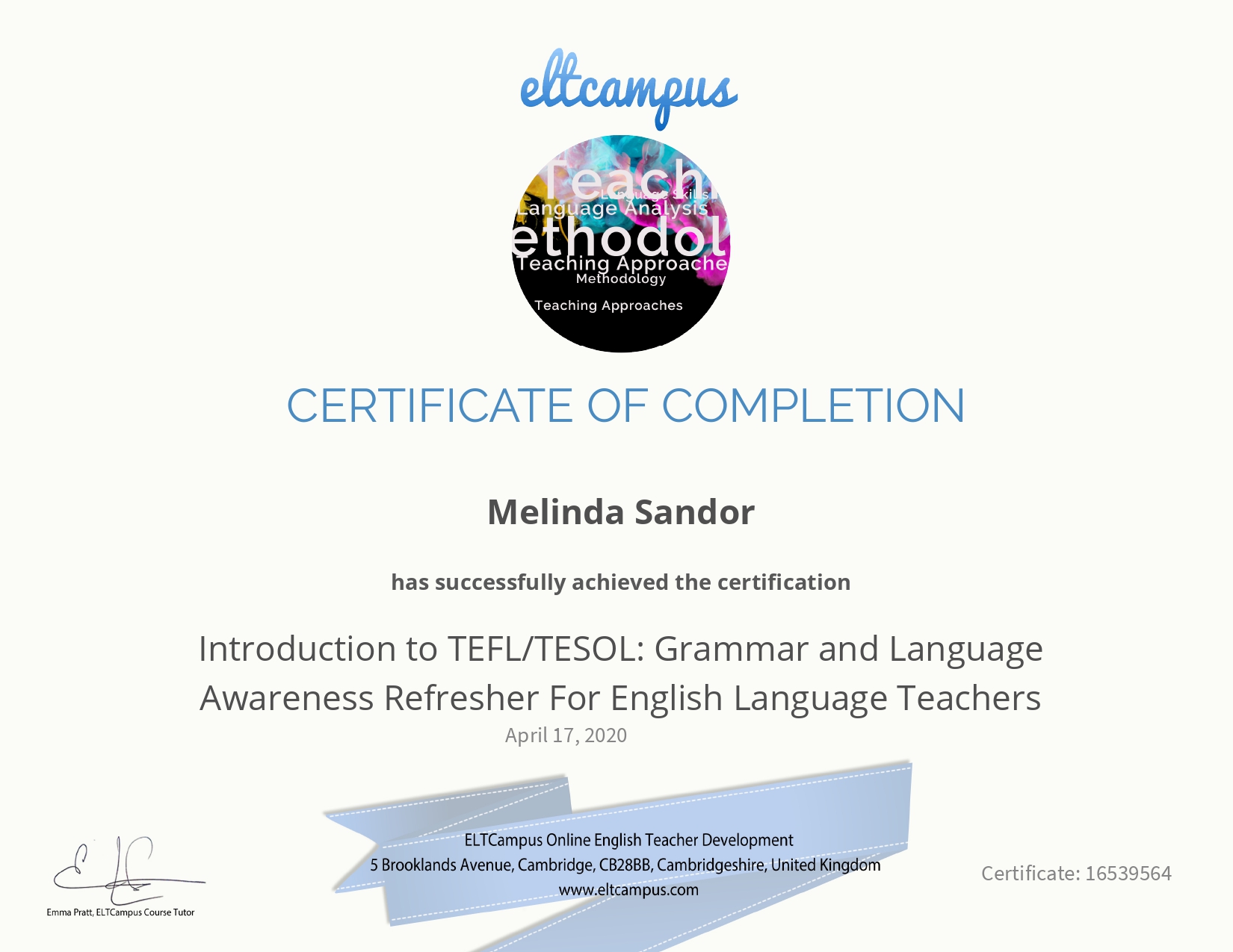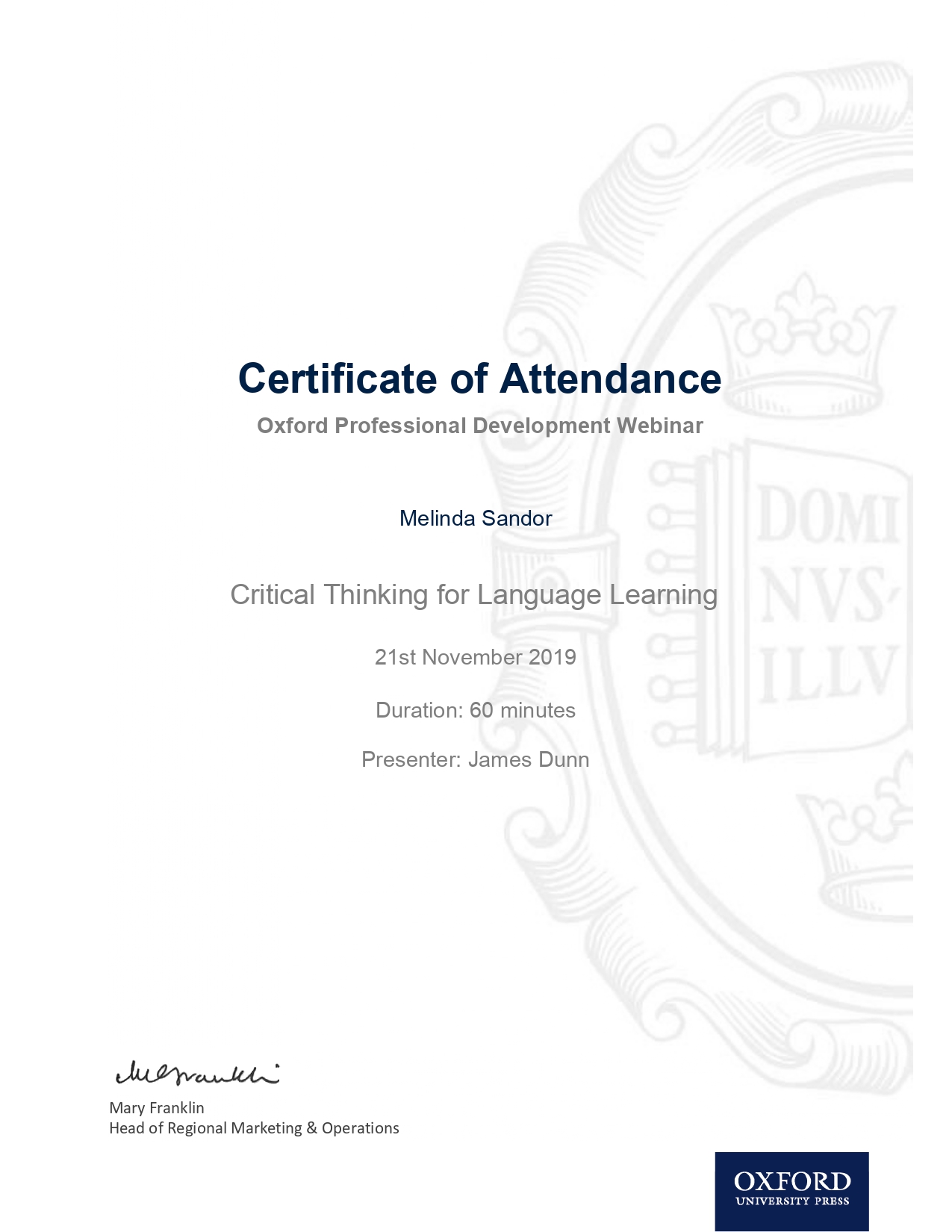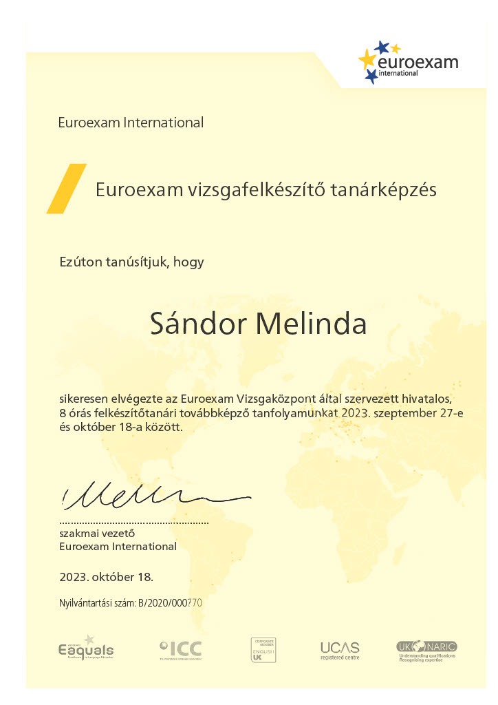 Folyamatos továbbképzéseken veszek részt Oxford webinárok keretében, ahol különböző nemzetiségű angol oktatók mutatnak be egy-egy hasznos oktatási területet a világ legkülönfélébb részeiről. Emellett évente legalább egy hosszabb továbbképzésen is részt veszek, ahol nemzetközi trénerektől tájékozódom az aktuális nyelvészeti újdonságokról vagy éppen a jelenlegi projektjeimhez szükségesnek találom egy-egy növendék speciális igénye, helyzete miatt.