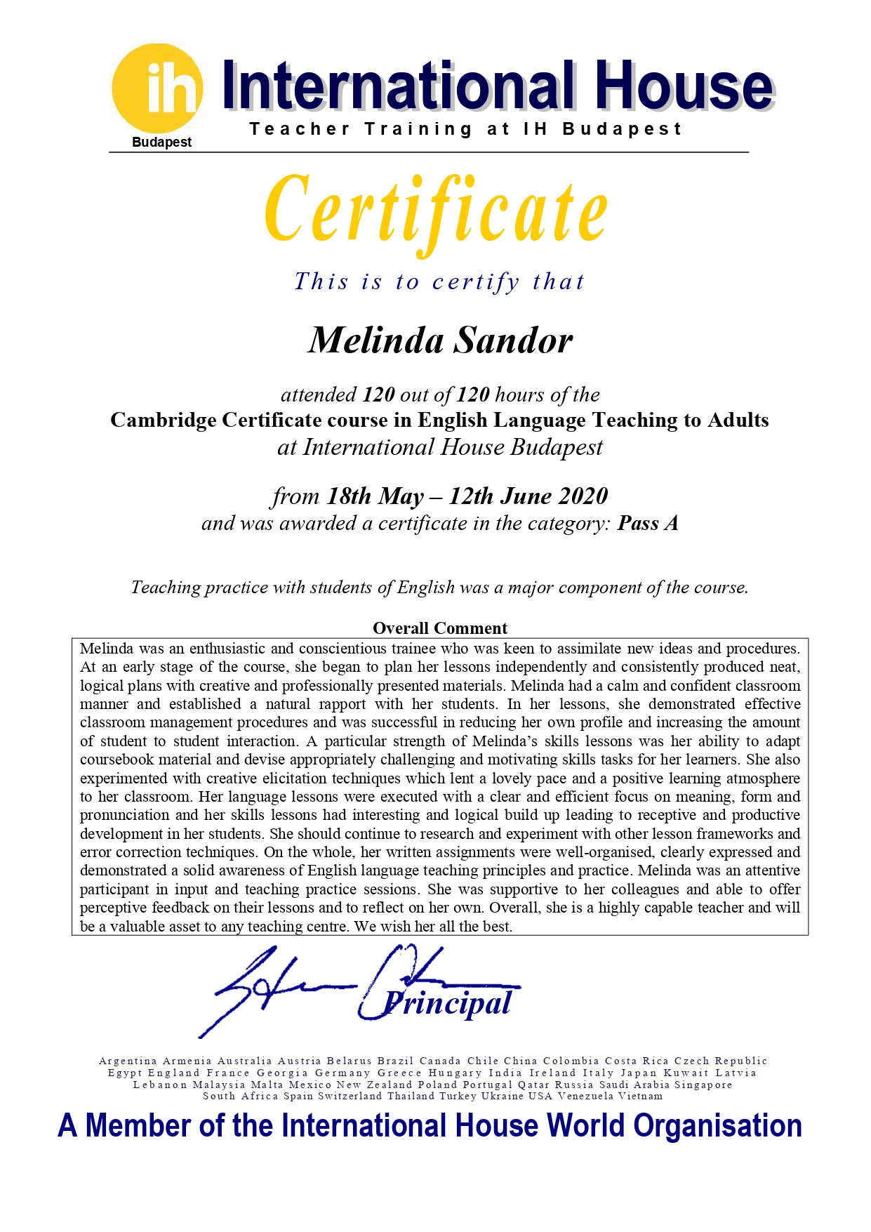 A gyermekvállalás közeledtével az üzleti élettől- intenzitása miatt - visszavonultam. Ekkorra már gyakorlott oktatóként , végeztem el a Cambridge Celta programot, amely egy nemzetközi angol oktatói szakképesítés. Itt kiemelkedő teljesítményért (Grade-A) minősítést kaptam. Ez azért ért meglepetésként, mert bár ez nem egyetemi szakképesítés mégis a képzési program hírhedt nehézségéről és nagyfokú terheléséről. Az oktatás anyanyelvi, egyetemet végzett trénerekkel angolul folyik és az első héttől kezdve próbaórákat kellett tartani nemzetközi diákoknak.